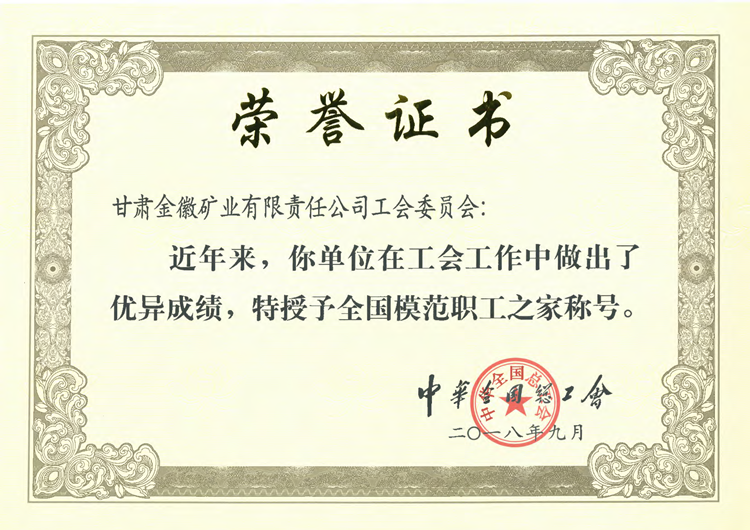 近日,金徽股份工會(huì)榮獲“模范職工之家”榮譽(yù)稱號(hào),這是繼金徽股份榮獲全國(guó)首批綠色工廠,入選國(guó)家級(jí)綠色礦山名錄之后獲得的又一項(xiàng)國(guó)家榮譽(yù)。